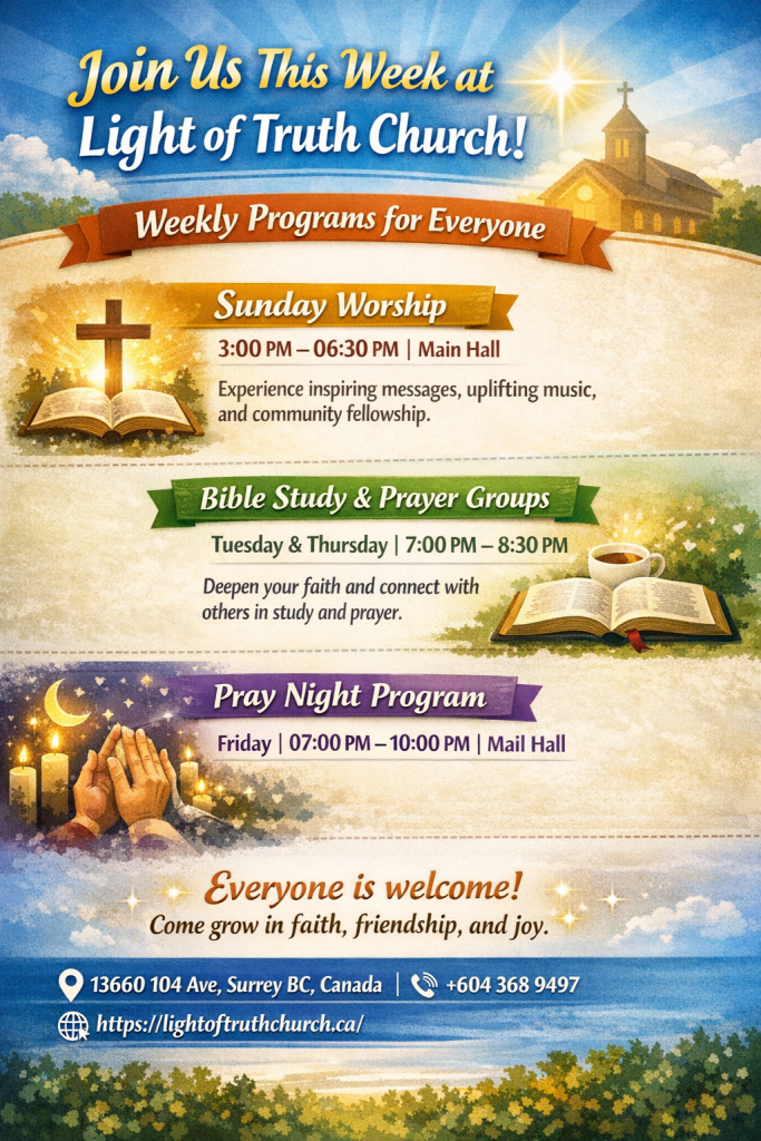 Welcome to Light of Truth Church, a Christ-centered evangelical Pentecostal church in British Columbia, Canada. We are a welcoming church family where people come together to worship God, grow in faith, and live according to the truth of Jesus Christ. At Light of Truth Church, we believe Jesus is the…